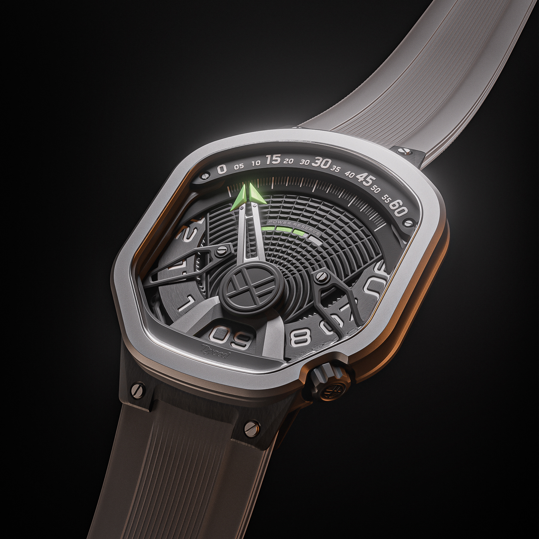 Dyced Heure Sautante This design represents my interpretation of a futuristic timepiece, featuring the Heure Sautante complication. In this concept, I sought to blend a variety of contemporary materials, including sapphire crystal and carbon fiber, to create a bold yet sophisticated aesthetic. The open design concept seamlessly combines the elements of a skeleton watch with a barebones mechanical style, offering a view into the intricate inner workings of the timepiece. The Heure Sautante—a jumping hour complication—and the power reserve indicator, both legendary features in the history of watchmaking, are reinterpreted here with a modern twist. These classic complications are reimagined to fit within the futuristic vision of the watch, paying homage to the past while pushing the boundaries of innovation. This concept brings together traditional craftsmanship and modern design, creating a striking balance between heritage and innovation.