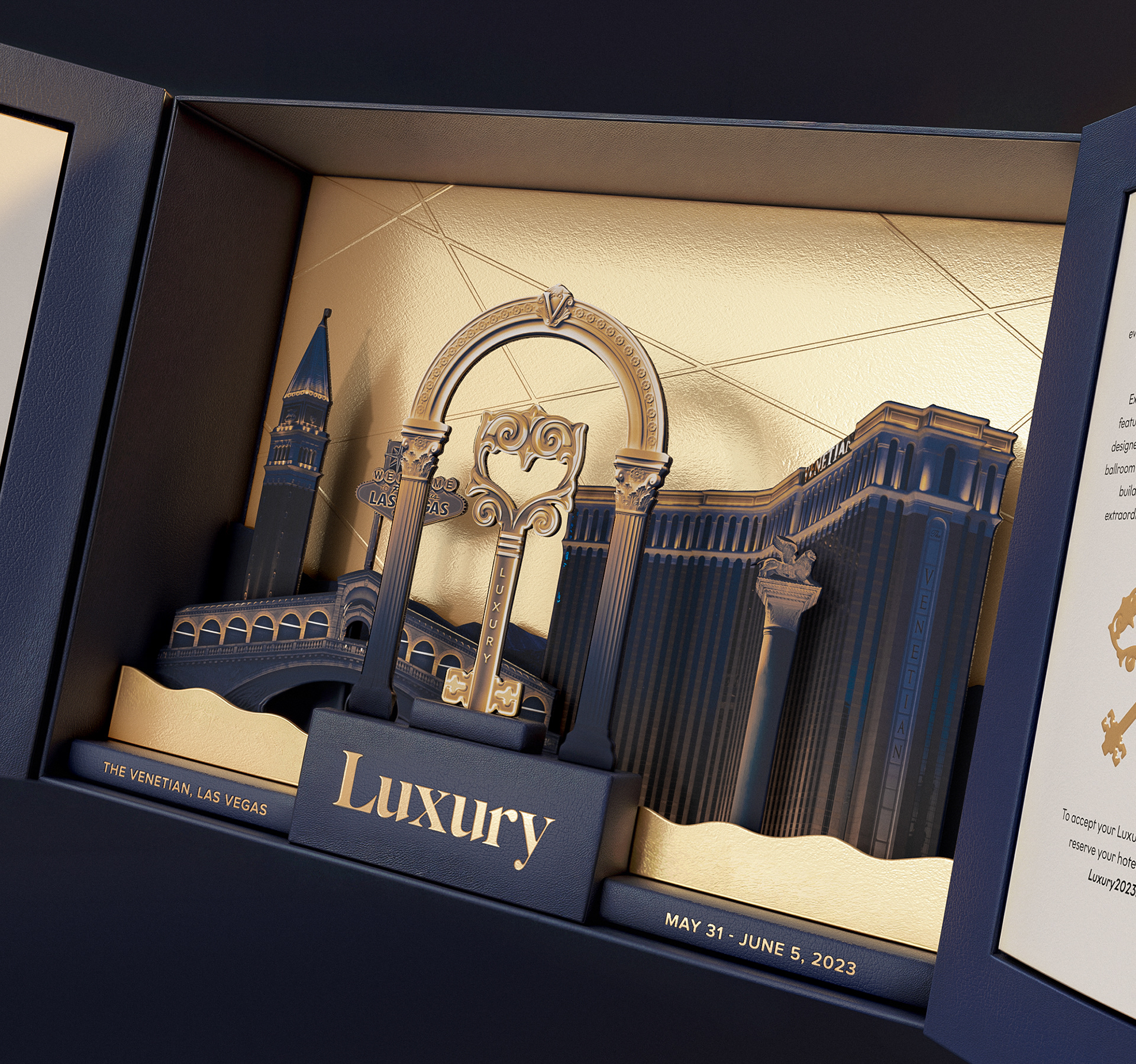 I had the pleasure of designing and art directing the invitation for Luxury 2023, a premium event held at The Venetian in Las Vegas, tailored for jewelry retailers and brands. Drawing inspiration from the architecture of The Venetian and the vibrant nightlife energy of our guests, we aimed to create an invitation that reflected both the elegance of the venue and the excitement of the event.